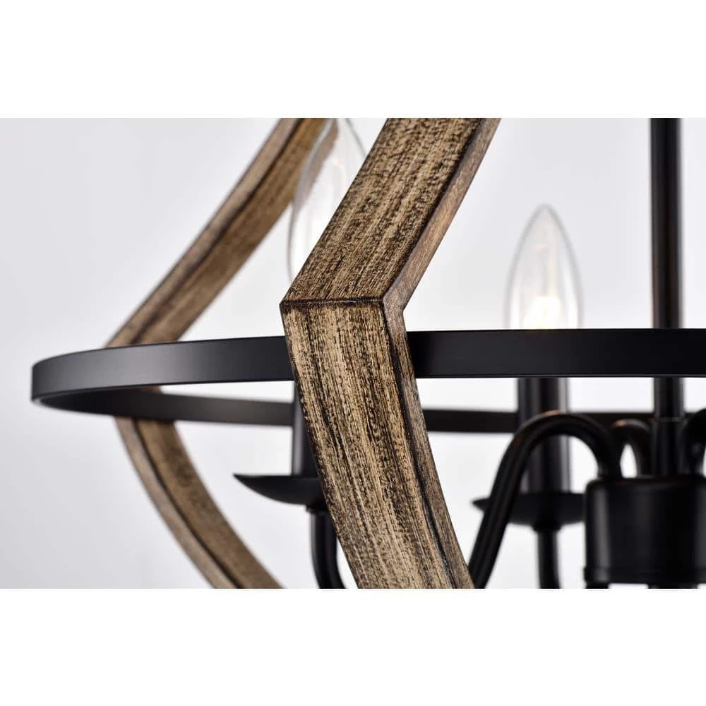 This sophisticated chandelier light features an imitation wood grain caged frame with exposed light bulbs that illuminate from within the center. The round mushroom design creates a vintage charm while the matte black metal hoop for stability within the lamp. This chandelier light suspends from a chain link that holds the 4 candelabra lights, where it anchors with a round metal canopy.