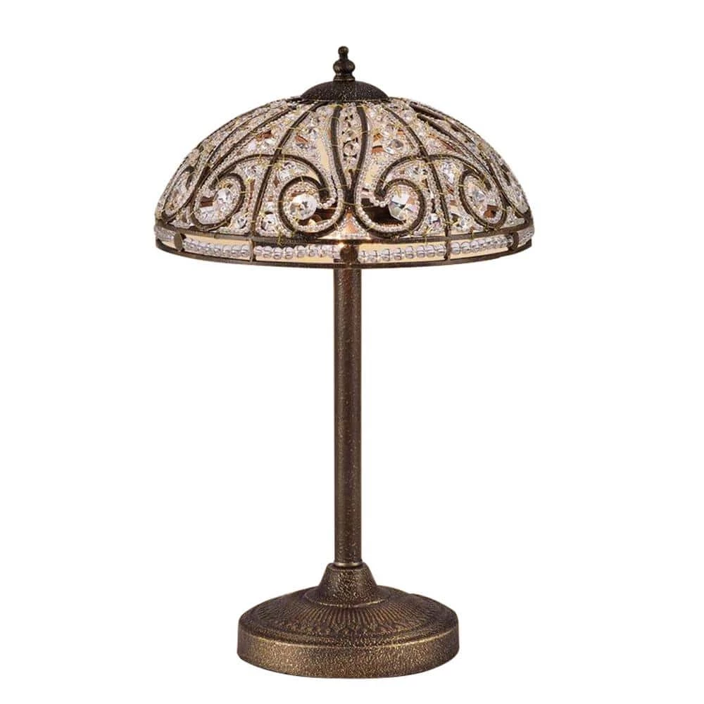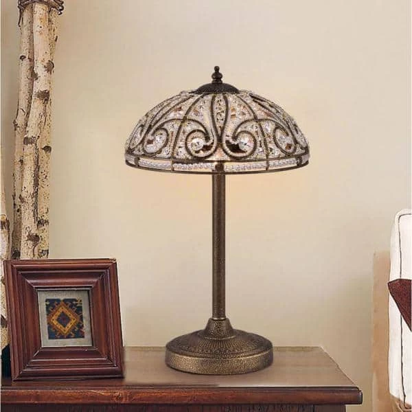 Bejewel your desk night stand or end table with the Warehouse of Tiffany Predima table lamp. Its finial-topped hemispherical shade sparkles with shimmering crystals set in a scrolling design. Underneath a slender column in an antique bronze finish holds up the lamp supported by a broad round base.