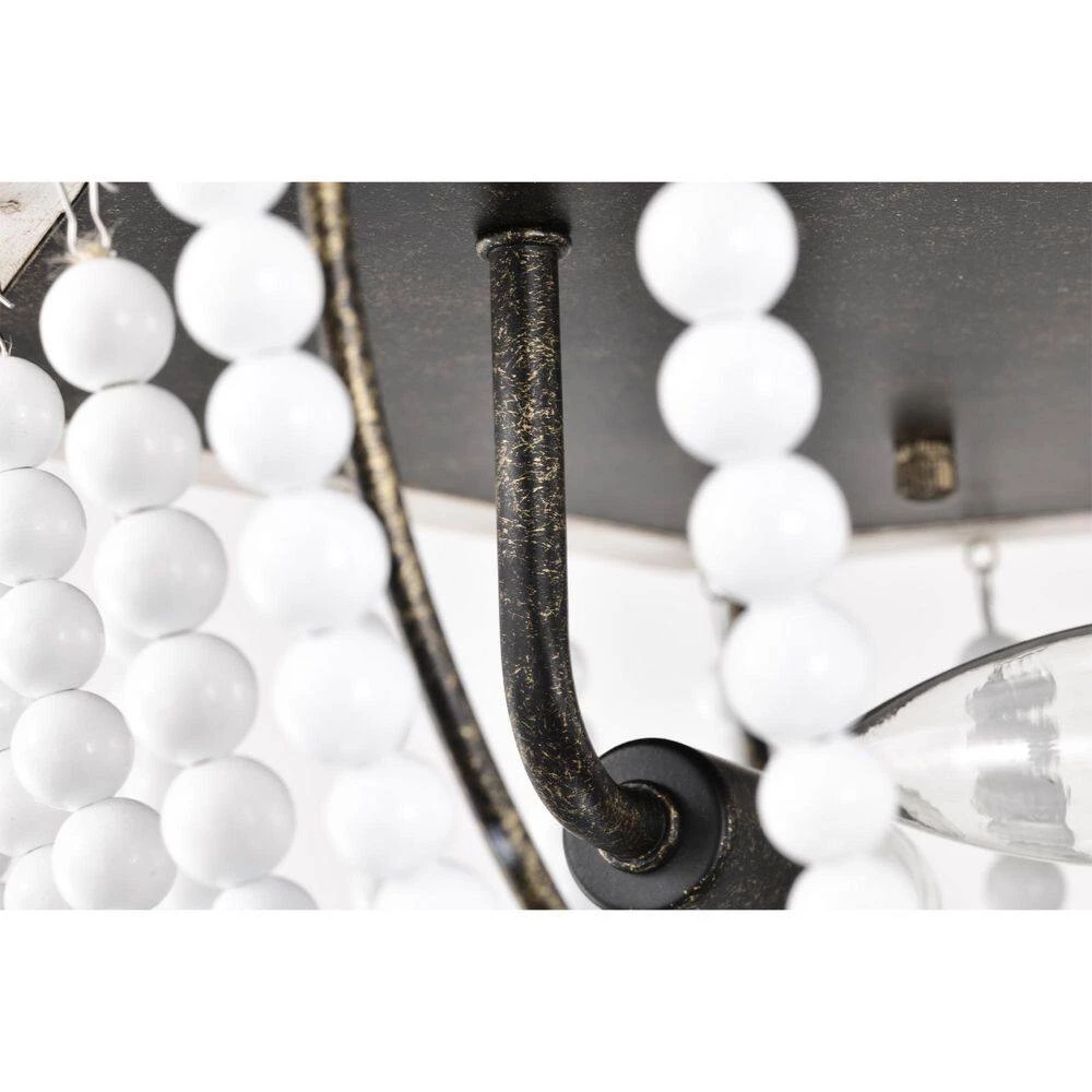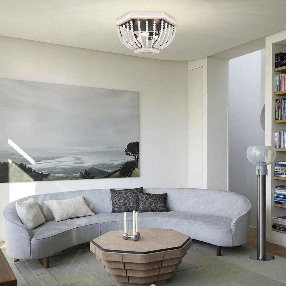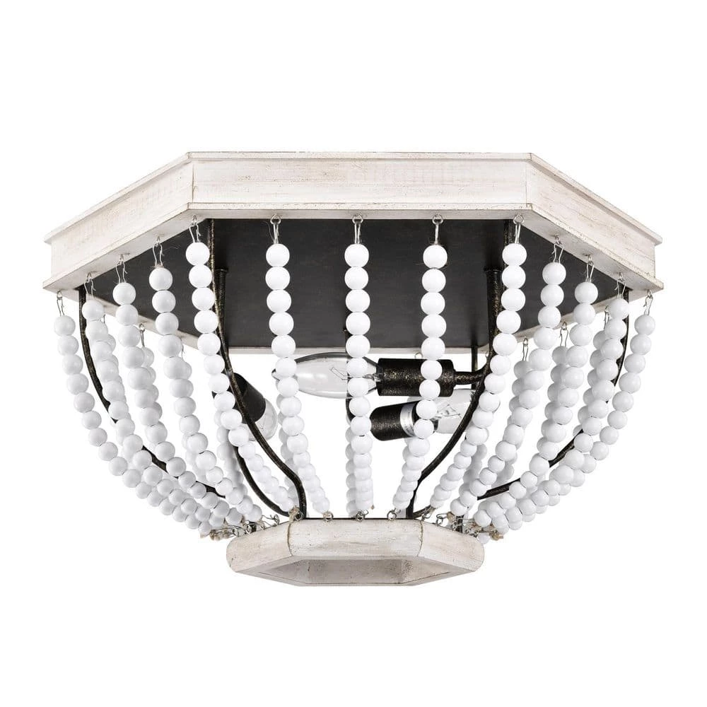 Freshen up your living space with the help of our 18 in. Beige Faux Wood Grain and Gloss White Pryne Flush Mount Ceiling Light. Our fixture features 3-lights, a beaded shade and a unique design that is bound to turn your home into a dream come true. Decorative during the day and decoratively functional at night, get the best of both worlds with our 18 in. Pryne Flush Mount Ceiling Light.