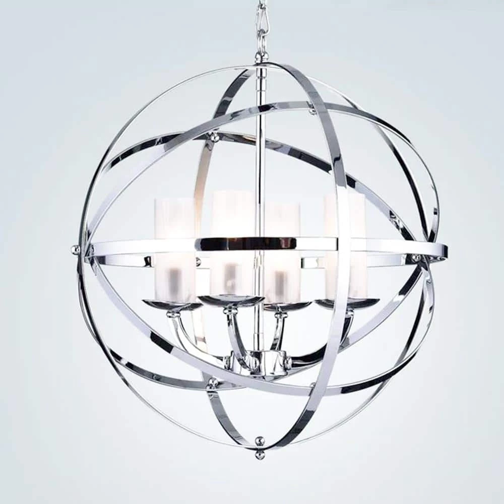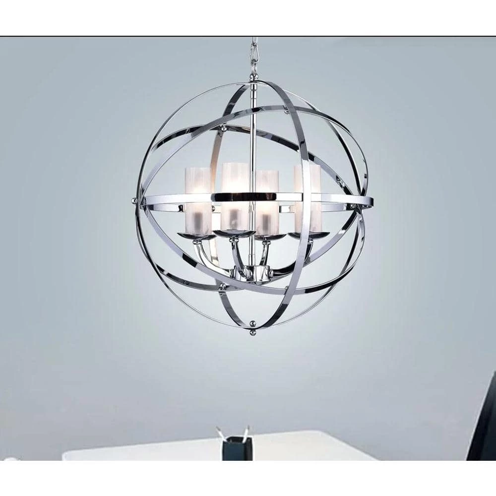 Brilliant and uniquethis chandelier will add extra sophistication to your home. The globe design is crafted from crossing bands of metal. The chrome finish gives the chandelier a futuristic lookwhile the 4 lights inside add a classic touch. This striking chandelier will make a beautiful addition to your living roomdinging roomor foyer. Features, Chrome-finish chandelierGlass shades over light 4-light chandelier.