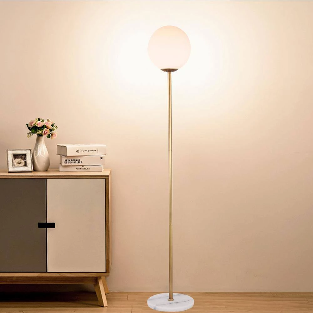 Add a touch of elegance to your bedroom, living room or study with this antique gold 1-light floor lamp. The metal finish beautifully contrasts with the frosted globe shades and round white marble base, giving the overall fixture a touch of modernity. It’s easy to assemble.