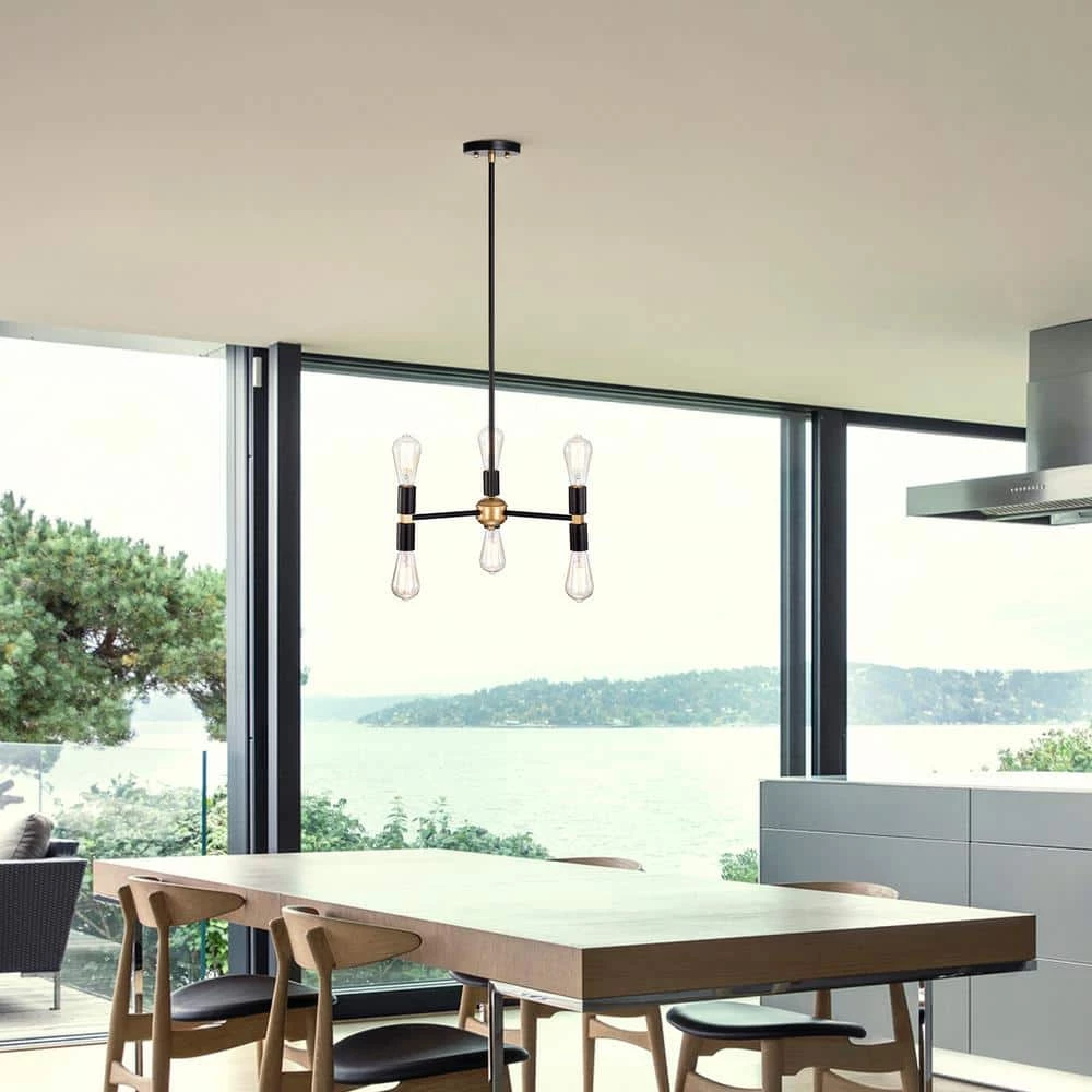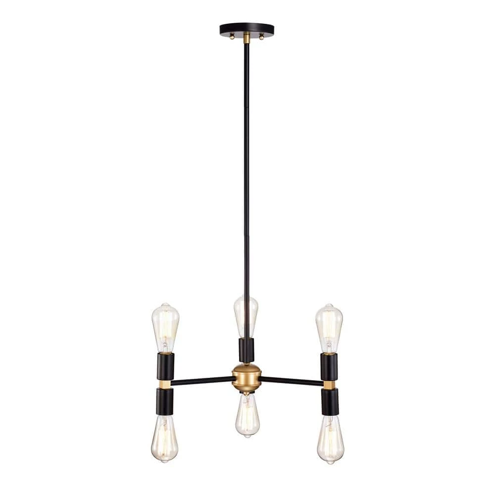 This modern 6-light chandelier will bring a brilliant atmosphere in your home. Metal frame with matte black finish and gold accent brings industrial charm and looks durable. Perfect for those looking for a dazzling centerpiece above kitchen islands, dining rooms and living spaces.