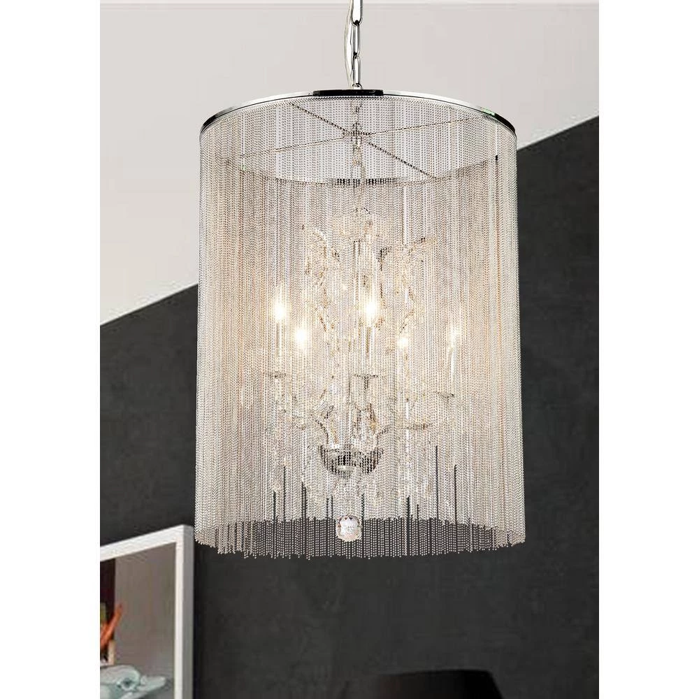 The Rosalias Modern Cage 6-Light Chrome Chandelier features different-sized crystals that hang from a chrome-finished frame. A circular row of chains surrounds the fixture creating a unique sophisticated look. A modern take on a cage design, this 25 in. high chandelier has nuanced elegance. A fluid ring of chains shroud the crystal-draped 6-light chandelier.
