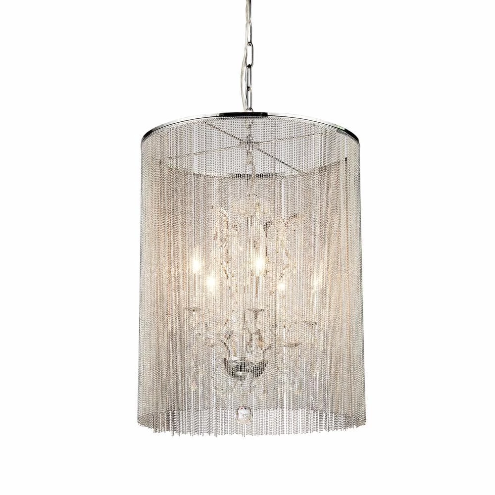 - A modern take on a cage design, this 25 in. high chandelier has nuanced elegance, a fluid ring of chains shroud the crystal-draped 6-light chandelier