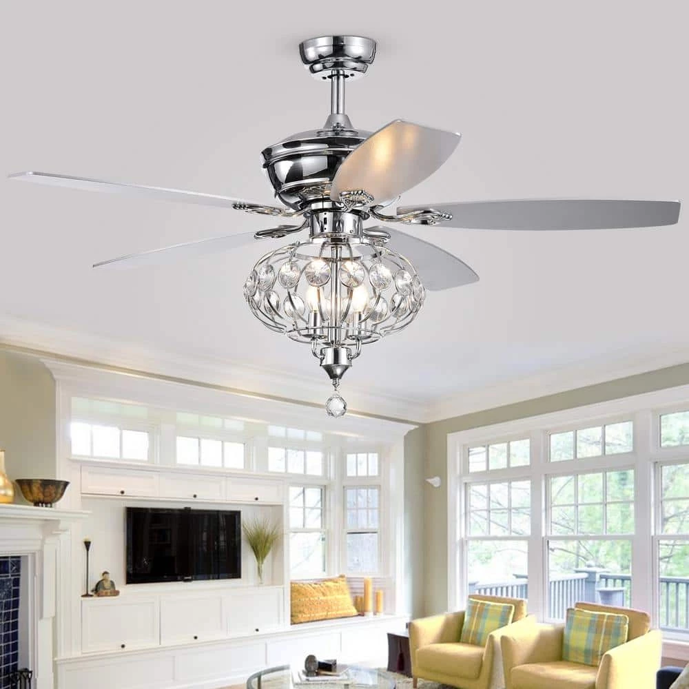 This beautiful lighted ceiling fan offers all of the above. Its elegant lines and bright clear crystals will add dignified style to your home. Polished chrome finish with silver wooden fan blades complete the stunning fixture.