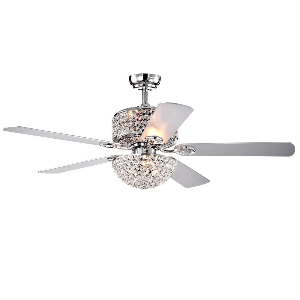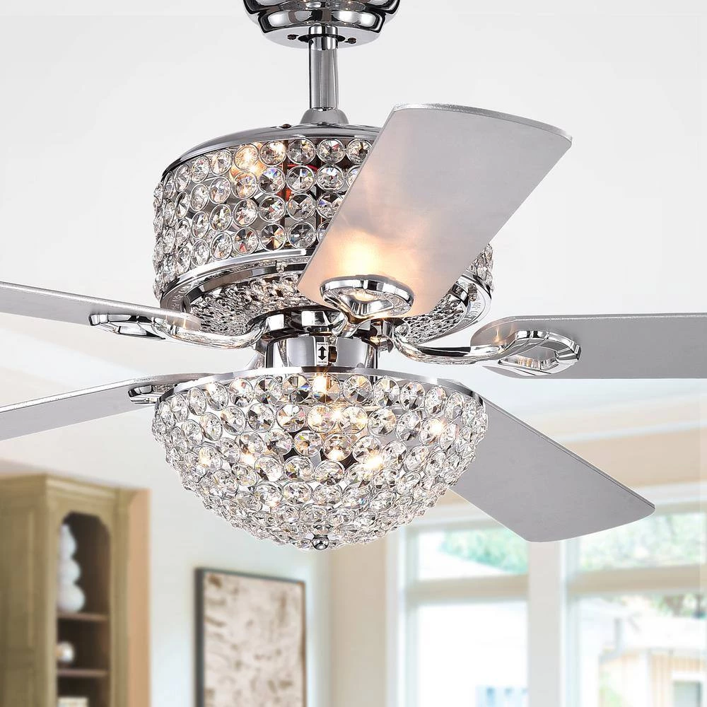 Keep the temperature comfortable year round and save money from having to turn on the air conditioning. This beautiful lighted ceiling fan is the perfect solution for your cooling needs while adding elegance to your home. Both upper and lower crystal shades shine when lighted and the fixture is finished in a lovely polished chrome.