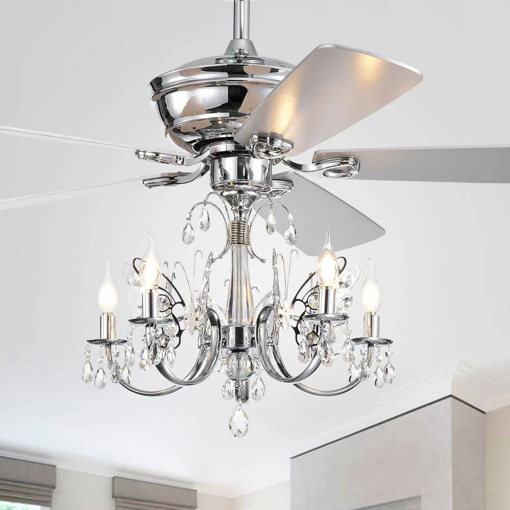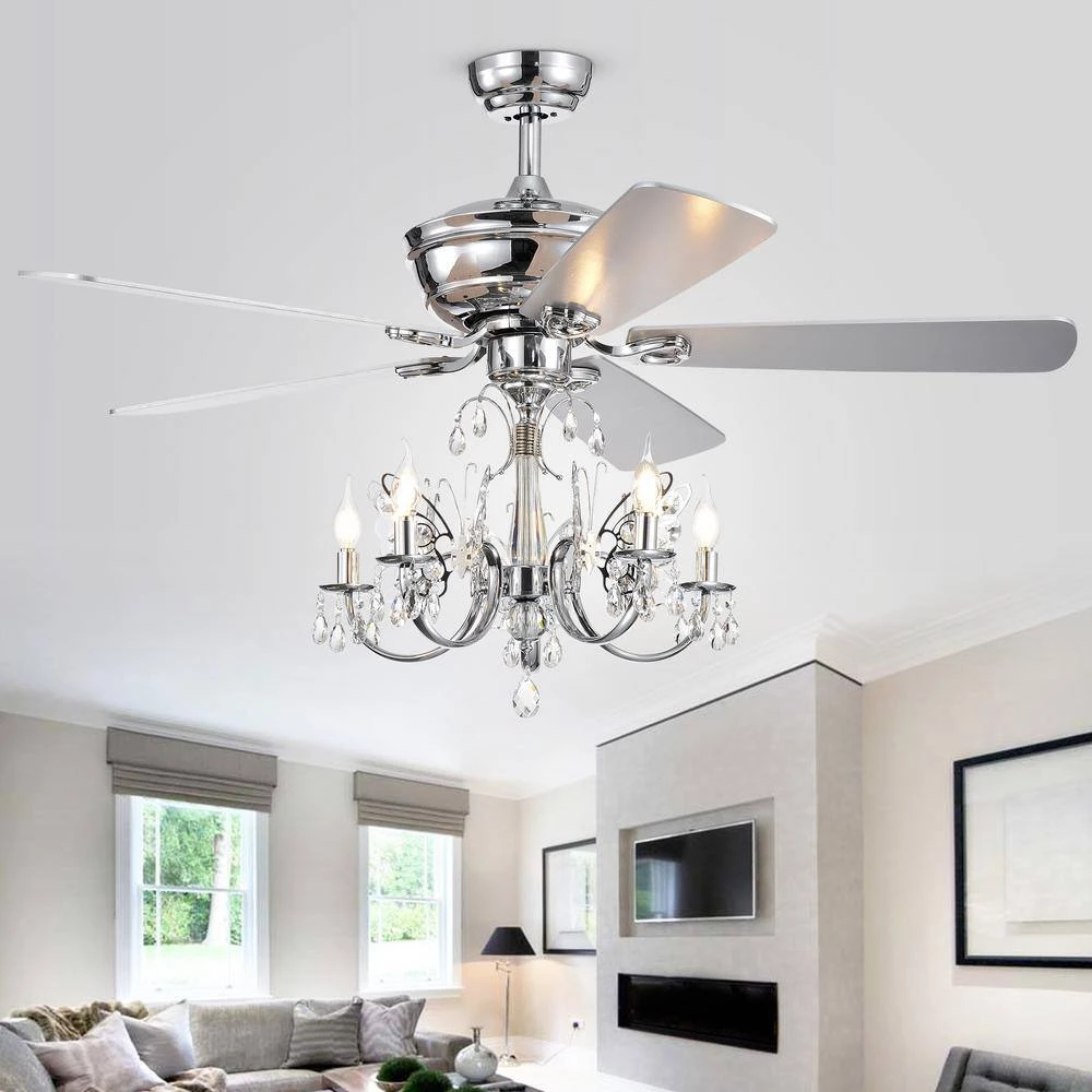 Introduce a breath of fresh air to your environment with our 52-inch Finlayson Chrome finished lighted ceiling fan. Our fixture is much more than just a ceiling fan, its also a chandelier. Have installed in your home a unique experience for everyone to enjoy. This fixture includes a five (5) bulb candle-style design with hanging crystals to embellish our Finlayson fan chandelier. Control the level of your cooling experience with the included remote at the palm of your hands.