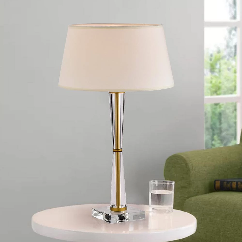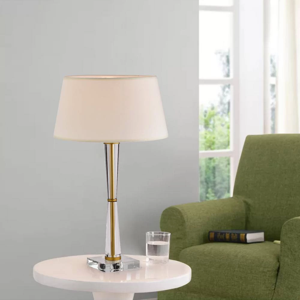 Illuminate your desk or end table with this glamorous 1-light table lamp. The base is made of clear-cut crystal while the shade is made of fabric available in off-white color. It also features a matte gold metal rod that ensures the strength and durability of this table lamp. This lamp produce multi-directional illumination that will give you cozy and warm glow so you can read or work in comfortably lighting.