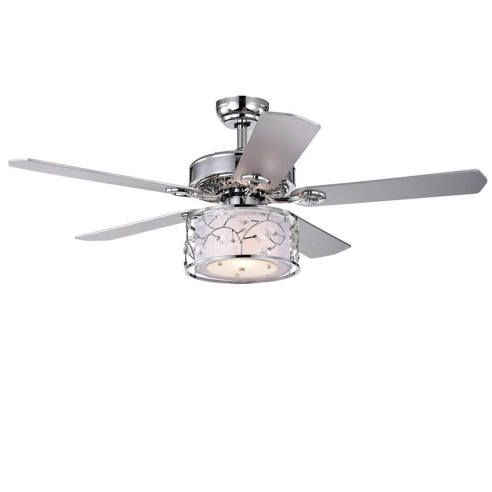 This delicately styled lighted Remote Controlled Ceiling Fan is a great solution for better air quality. Made with a double layer of sheer fabric shading with an lovely outer frame of crystal leaves on chrome branches. A frosted glass covers the bottom light vent to complete the elegance of this fixture. The 3 speed reversible motor insures you find just the right level of cooling comfort. Remote Controlled for extra convenience.