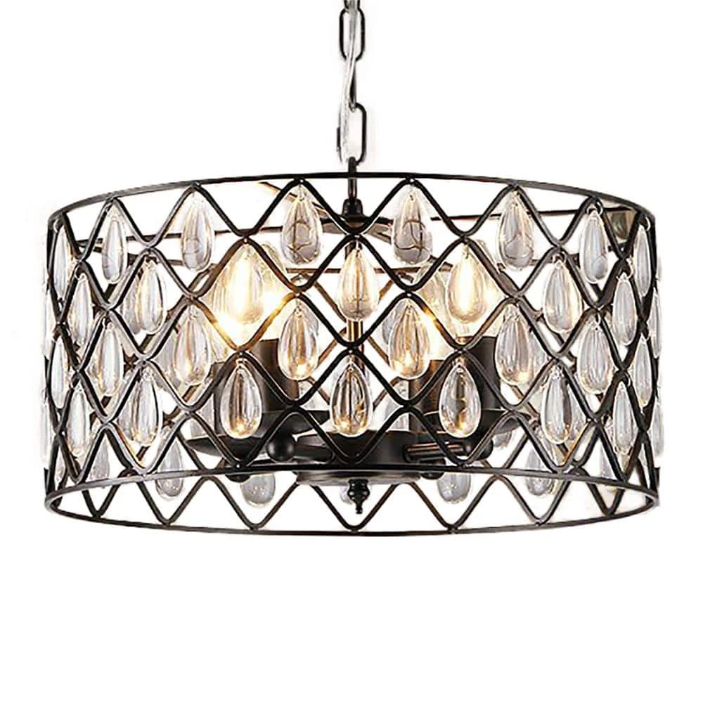 Cast a glittering glow over kitchen islands and tables with this contemporary cage pendant. Strung with teardrop glass accents the caged drum features a soft diamond pattern in black for intriguing contrast and accommodates 4-light bulbs for bright multi-directional illumination. This Chandelier will offer significant amount of light across the room.