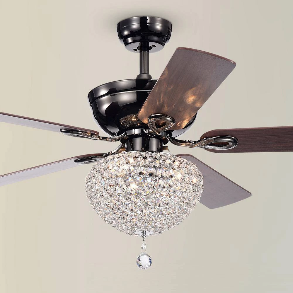 This Remote Controlled Ceiling Fan combines a sleek contemporary black metal finish housing with a more traditional full crystal basket lamp shade with a drop pendant crystal finial. The wood blades offer great air movement to save your electricity bill from running the air conditioning. The motor is reversible to control the best flow for the season.
