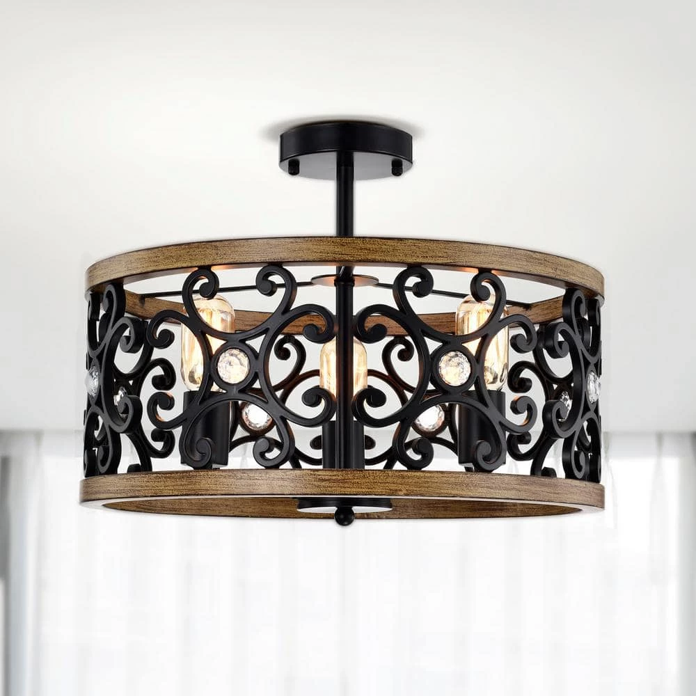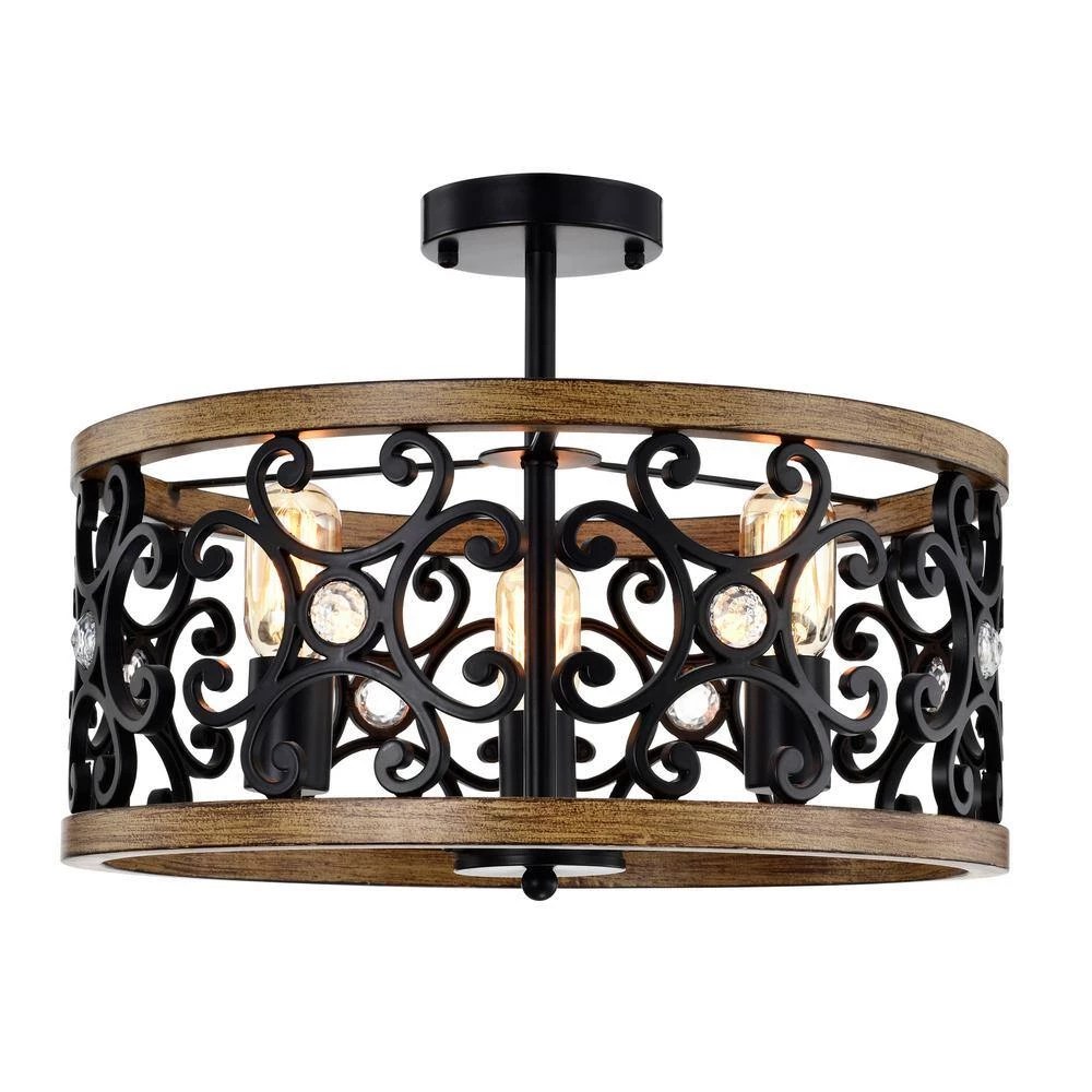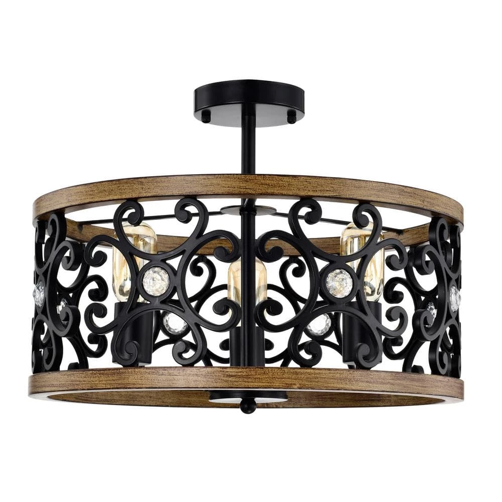 Wake up to a dream come true with our 18 in. Matte Black and Faux Wood Grain Tase Semi-Flush Mount Ceiling Light displayed in your home. Our fixture features 3-lights all housed in a lovely designed caged shade that is embellished with crystal gems and a Faux Wood Grain trim. Decorative during the day and decoratively functional at night, get the best of both worlds with our 18 in. Tase Semi-Flush Mount Ceiling Light.