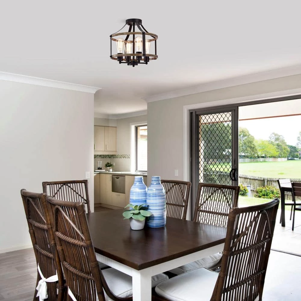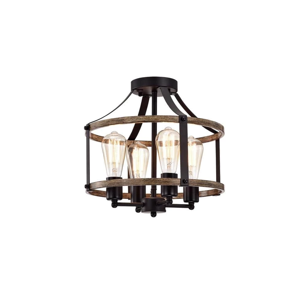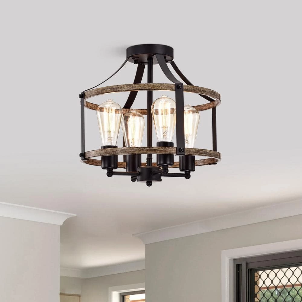 Scatter brilliant light in your home without sacrificing style with this semi-flush mount chandelier. This lamp features a 15 in. Dia open cage drum shade constructed with a center metal rod finished in matte black to add sturdiness and durability. The 4-light design is perfect for casting a vibrant light into any space.