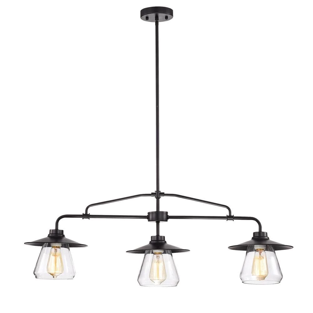 This full piped down rod metal chandelier with three hooded glass lamps is a fantastic addition to any home. Great character with the included Edison style light bulbs. Perfect in an industrial designed space over a long counter or dining table.