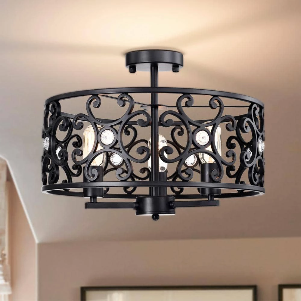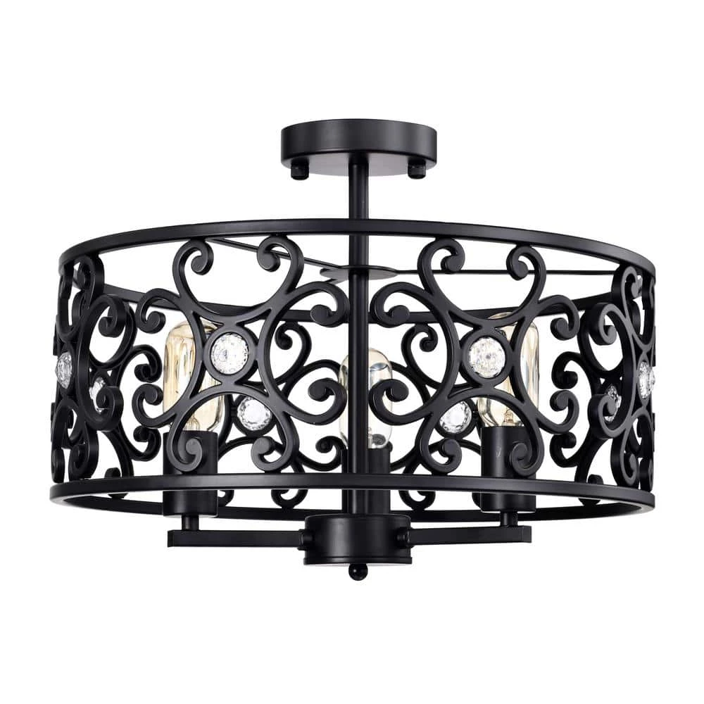 Introduce an aesthetic appeal into your home with our 18 in. Matte Black Theofy Semi-Flush Mount Ceiling Light. Our fixture features 3-lights that are housed in a lovely designed shade that is embedded with crystal gems and brings this fixture, full-circle. Decorative during the day and decoratively functional at night, get the best of both worlds with our 18 in. Theofy Semi-Flush Mount Ceiling Light.