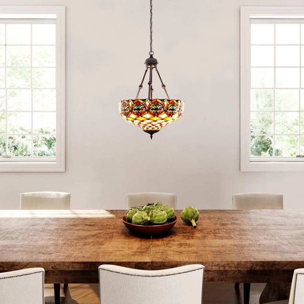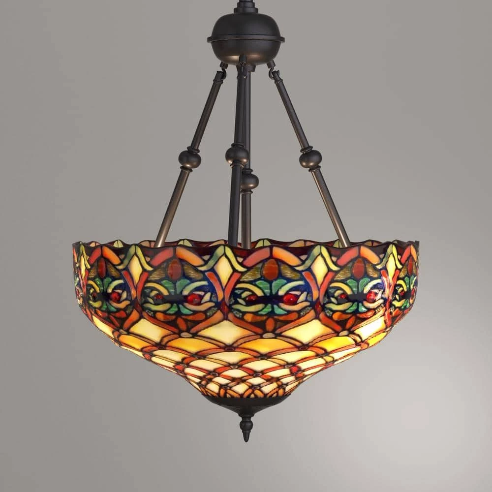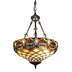 The Tiffany Style 48 in. Ariel Inverted Hanging Pendant has been handcrafted using methods first developed by Louis Comfort Tiffany. The Two 60-Watt light bulb provide illumination and enhances the beauty of each cut glass to your room. It features an elegant hanging fixture and shade contains more than 300 pieces of hand-cut glass wrapped in fine copper foil accented with rich vibrant cabochons.