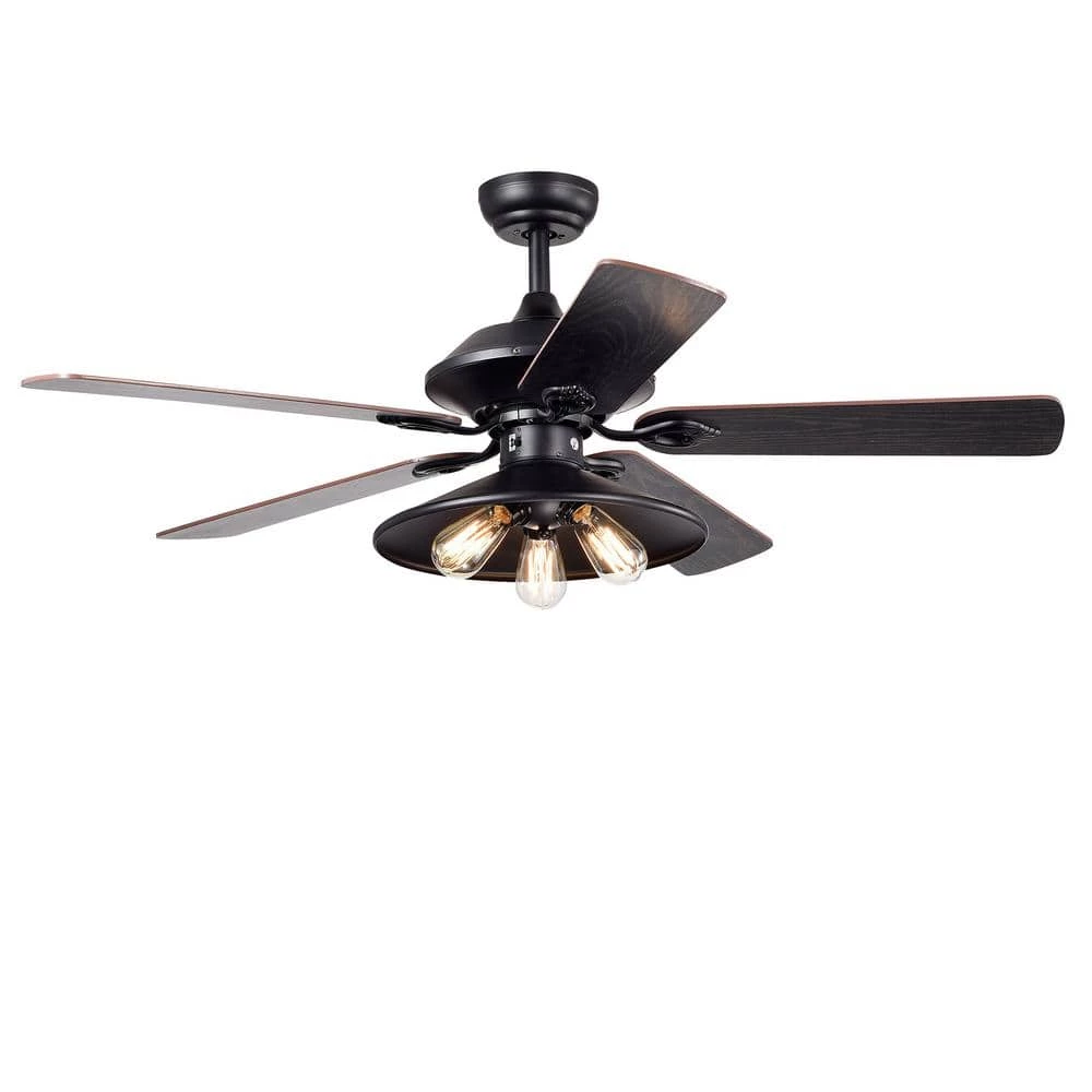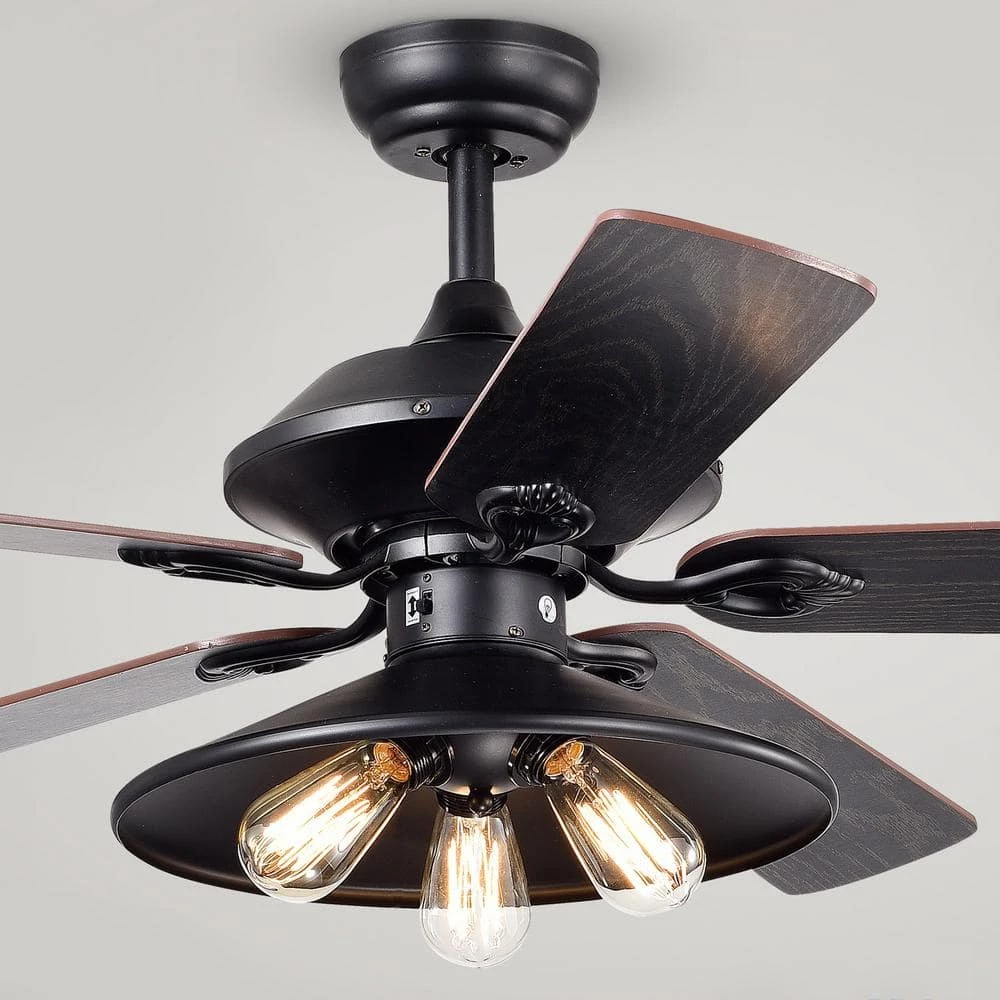 This is a modern lighted remote controlled Ceiling Fan with a classic hooded shade. A Matte Black finish with matching black stained wooden fan blades. All combine to offer you a well-made distinctive look with lots of character. The motor has three selectable speeds that will allow you to find the best level of cooling experience.