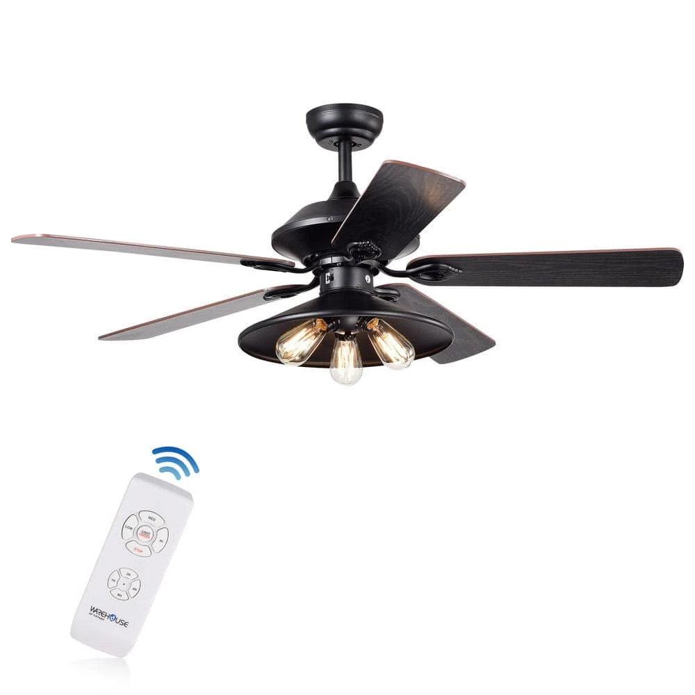 Reiterate your contemporary industrial design through this Upille five-blade ceiling fan. Black-stained wood blades blend into the matte-black iron base for a rich, bold look over your head. Three Edison-style light bulbs add a brightening effect to this dark ceiling fan to balance the look and illuminate your room.