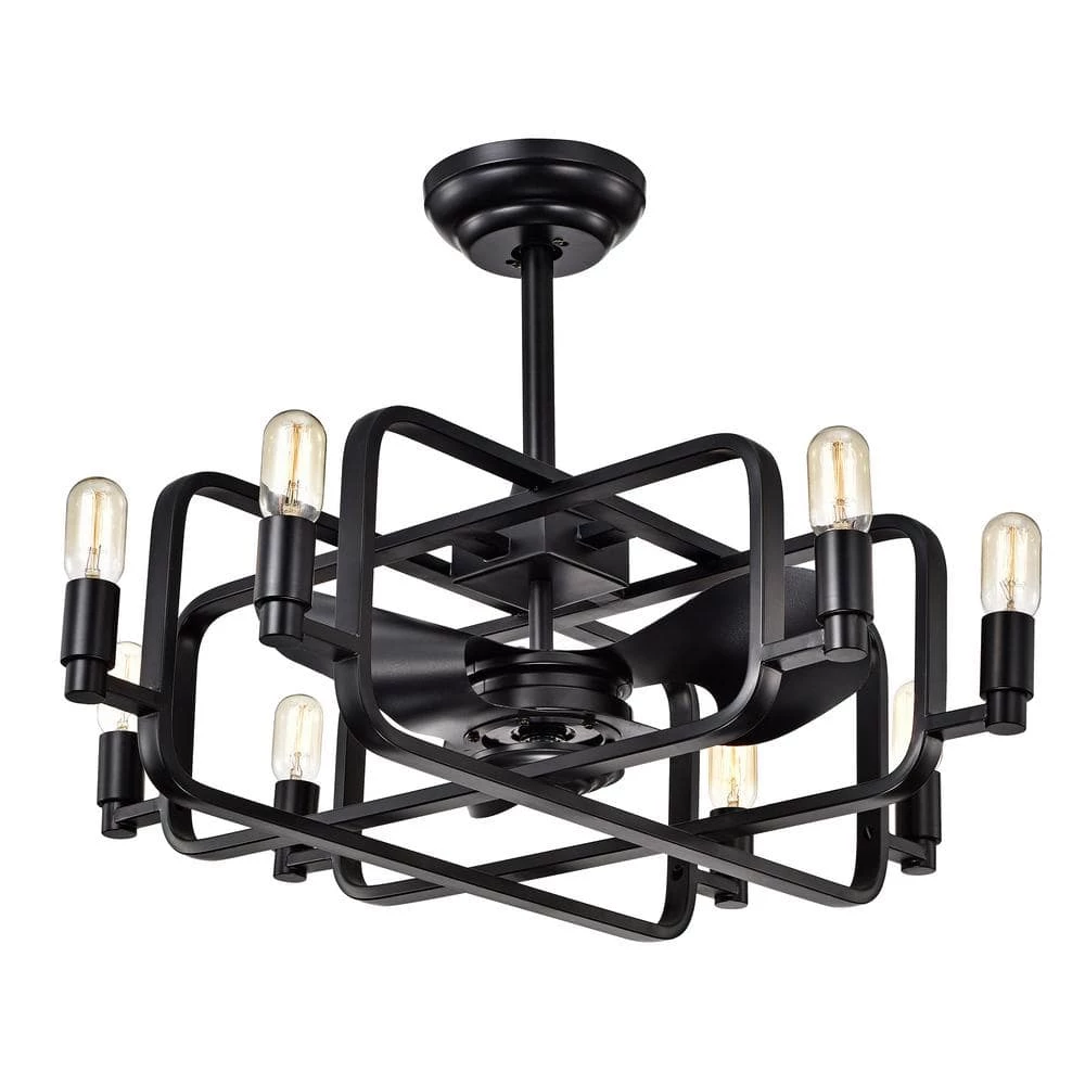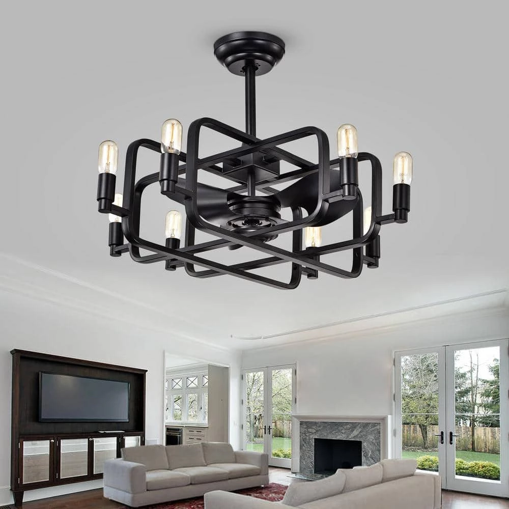 This hybrid Remote Controlled Ceiling Fan is a great solution. Hidden inside the black finished cross grid frame chandelier lies the highly functional full room fan. The 6 speed reversible motor insures you find just the right level of cooling comfort with included remote control for extra convenience.
