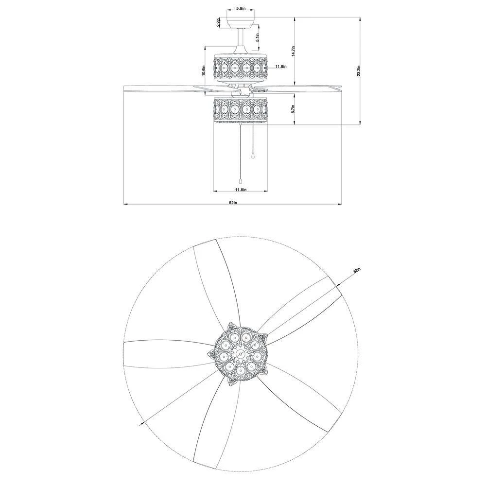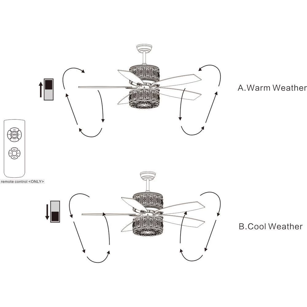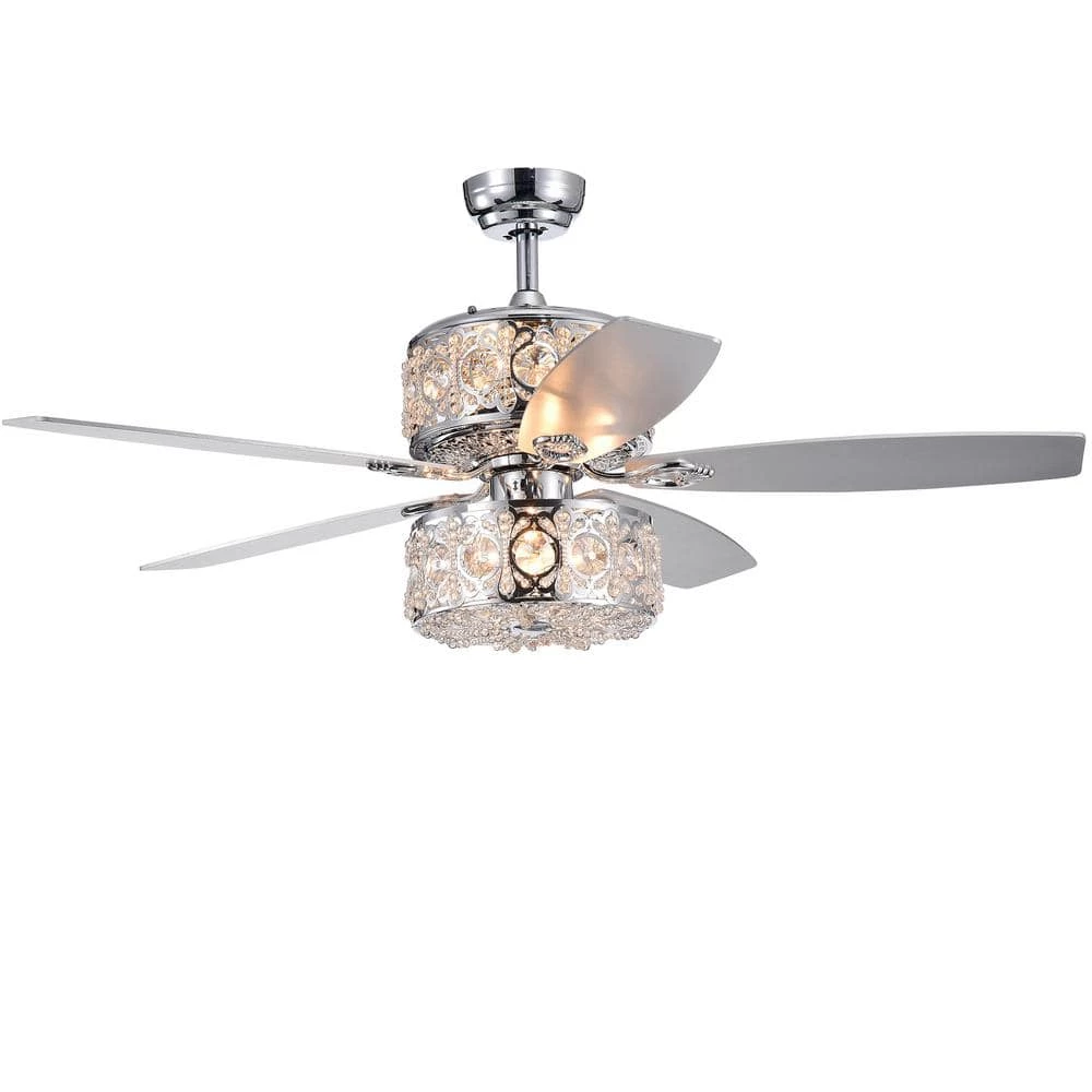 This dual layered lighted Remote Controlled Ceiling Fan is a magnificent fixture and a great solution for better air quality. The unique chrome patterned metalwork will and crystal embellishments is a glamorous addition to any space. Both upper and lower lamps offer excellent illumination. The 3 speed reversible motor insures you find just the right level of cooling comfort. Remote Controlled for extra convenience.